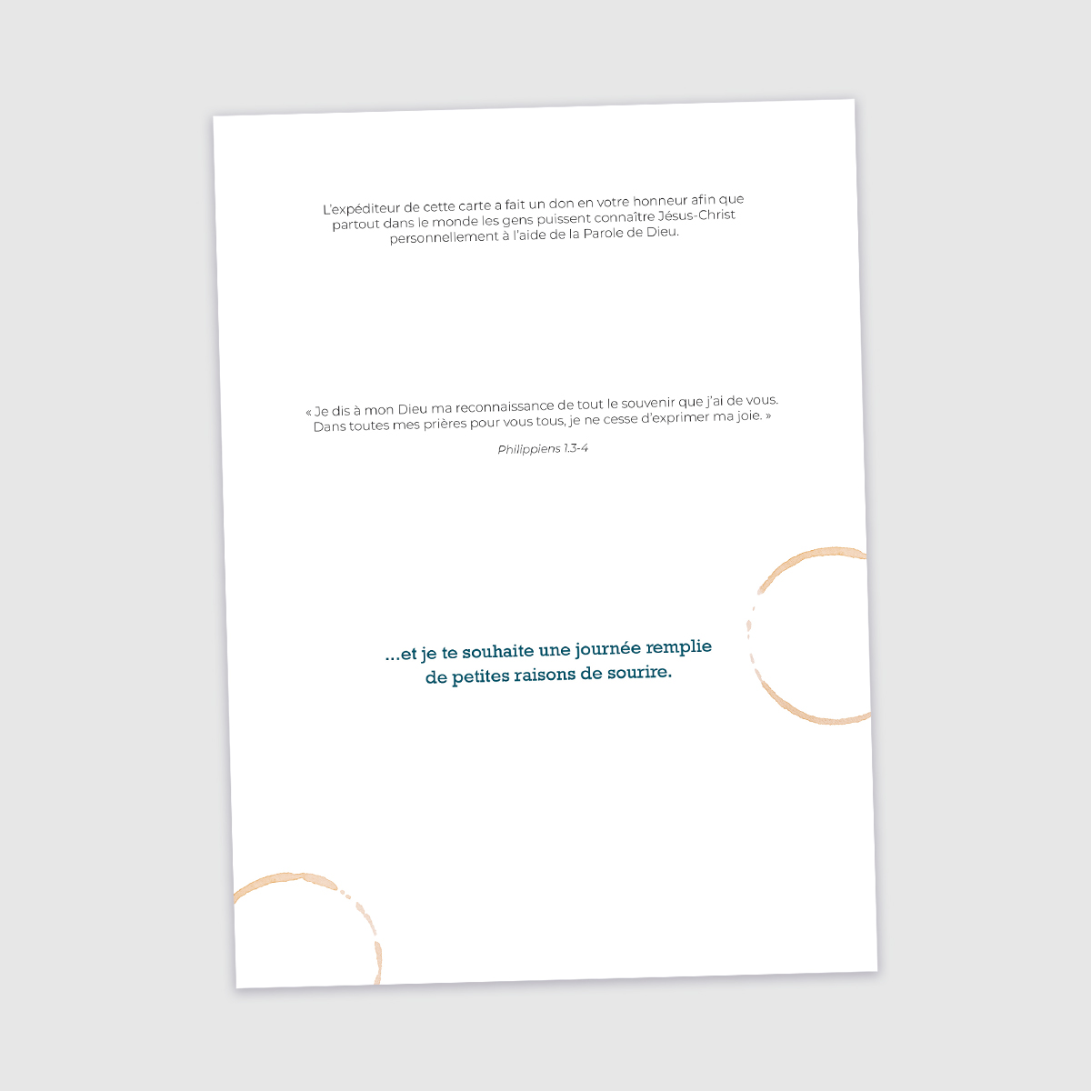 « Je dis à mon Dieu ma reconnaissance de tout le souvenir que j’ai de vous. Dans toutes mes prières pour vous tous, je ne cesse d’exprimer ma joie. » - Philippiens 1.3-4