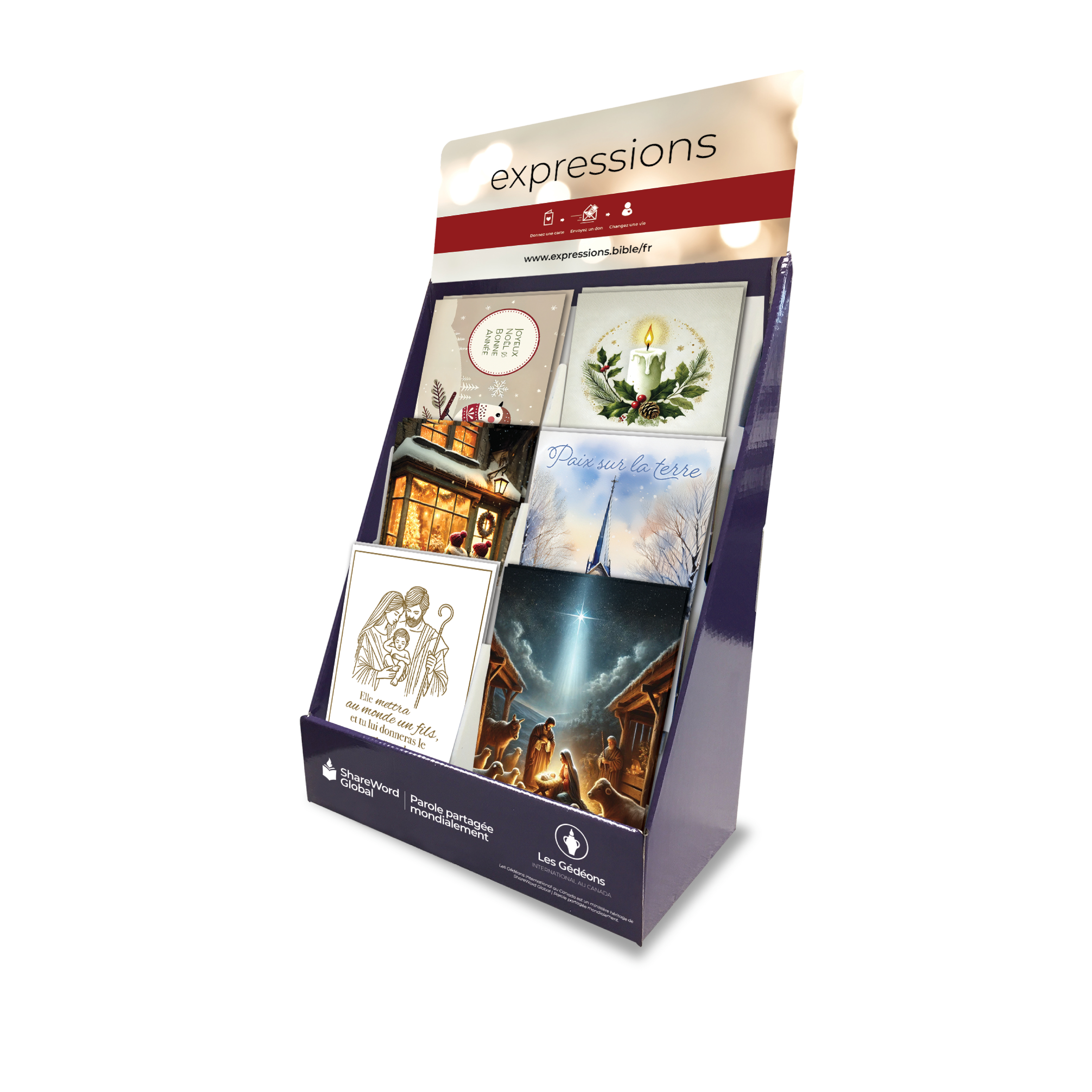 Cependant, l'utilisation des cartes de ce présentoir ne consiste pas seulement à trouver les bons mots à dire; c'est aussi un acte de générosité. Avec chaque carte choisie et chaque don effectué, vous contribuez à partager l'amour de Christ en plaçant des exemplaires de la Parole de Dieu entre les mains de personnes du monde entier.
